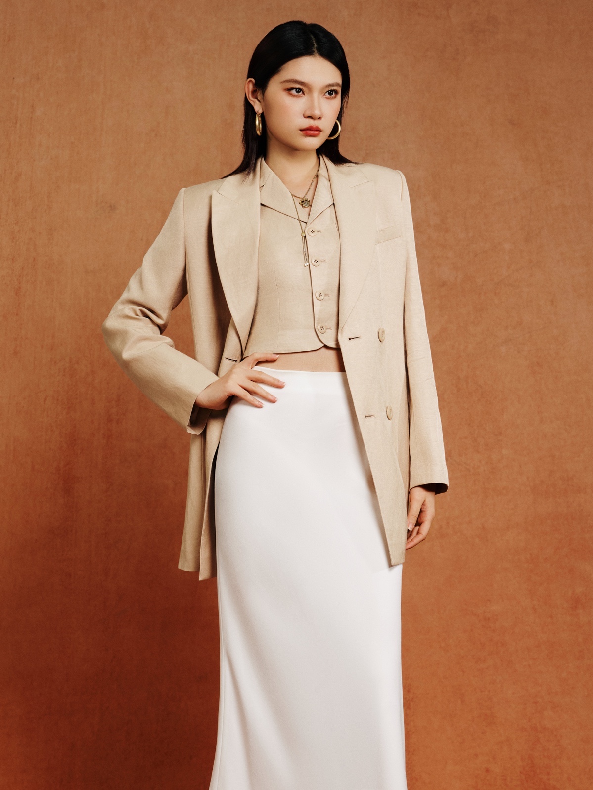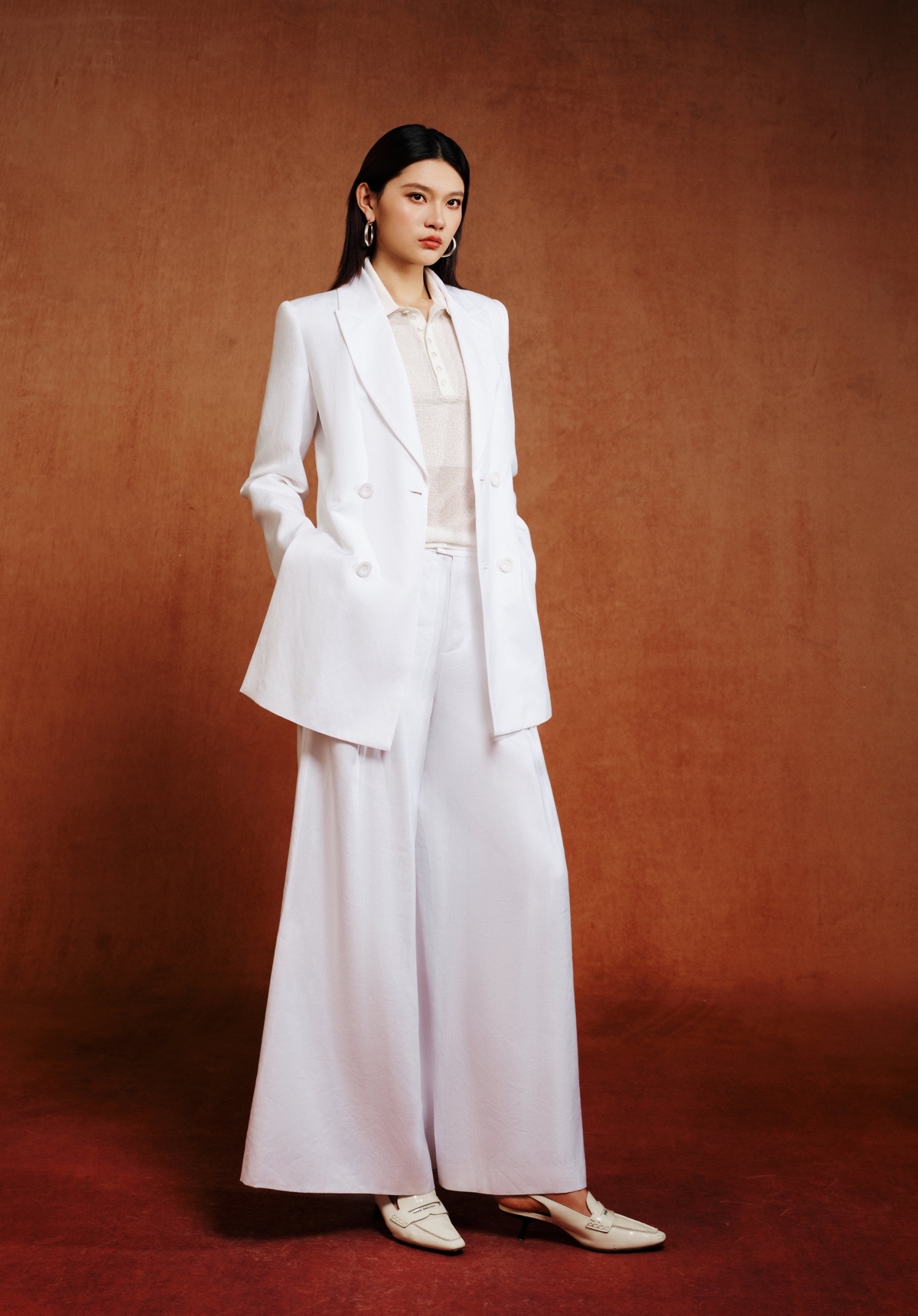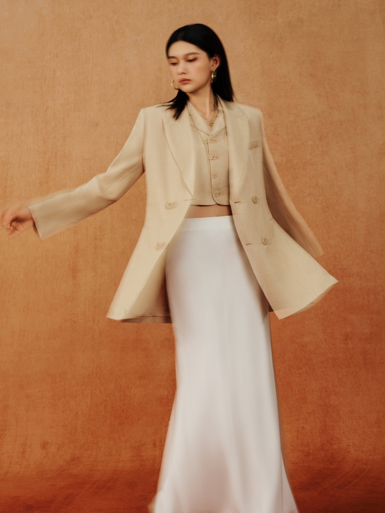 欣長身段遇見凌厲廓形,流動的弧線中和西裝硬度